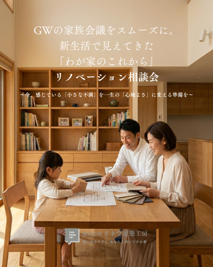 GWの家族会議をスムーズに。新生活で見えてきた「わが家のこれから」リノベーション相談会 〜今、感じている「小さな不満」を、一生の「心地よさ」に変える準備を〜