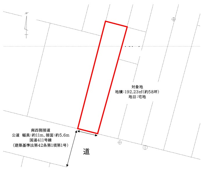 ・間口約5.6m、奥行き約30mの細長い土地形状です。