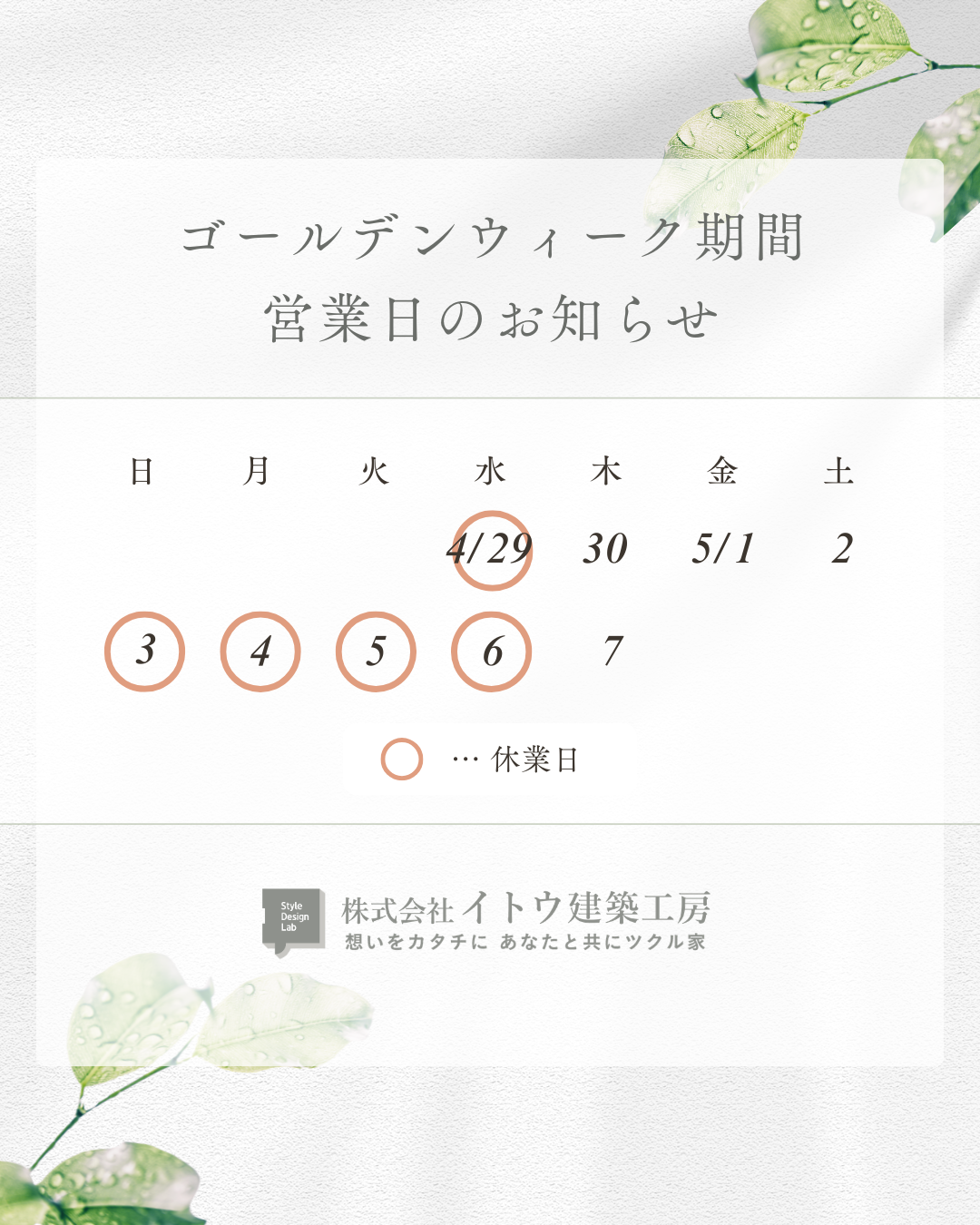 イトウ建築工房のゴールデンウィーク期間中の営業日は、画像のカレンダー通りとなります。